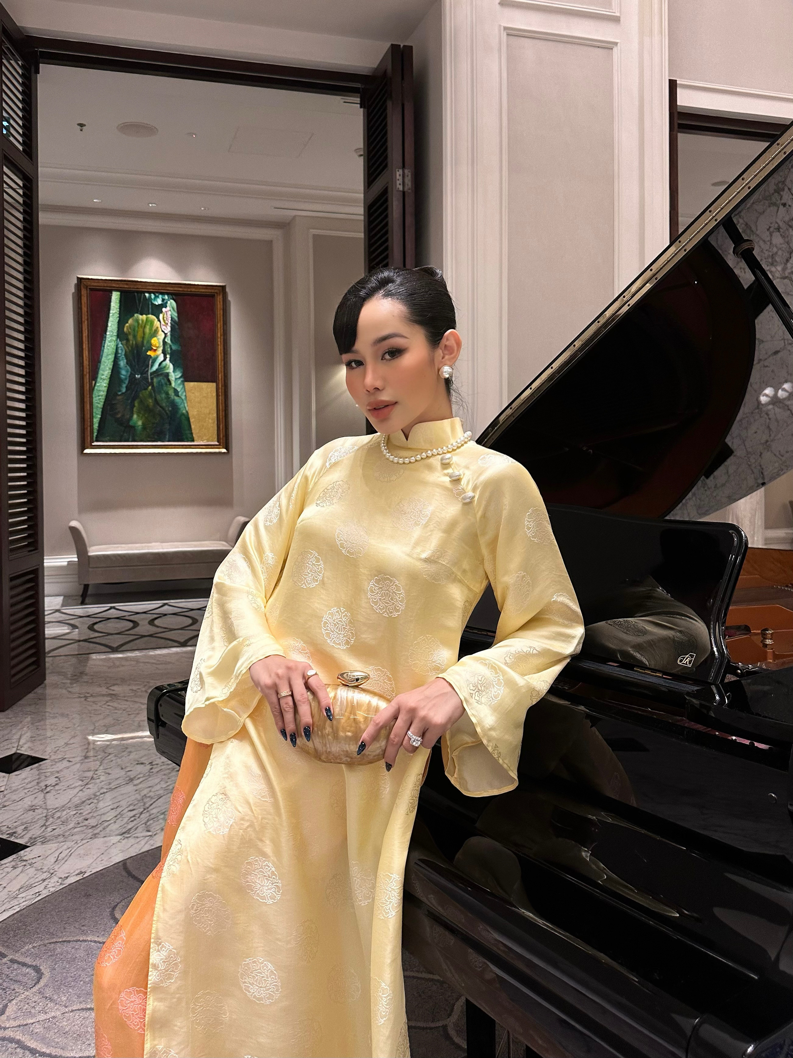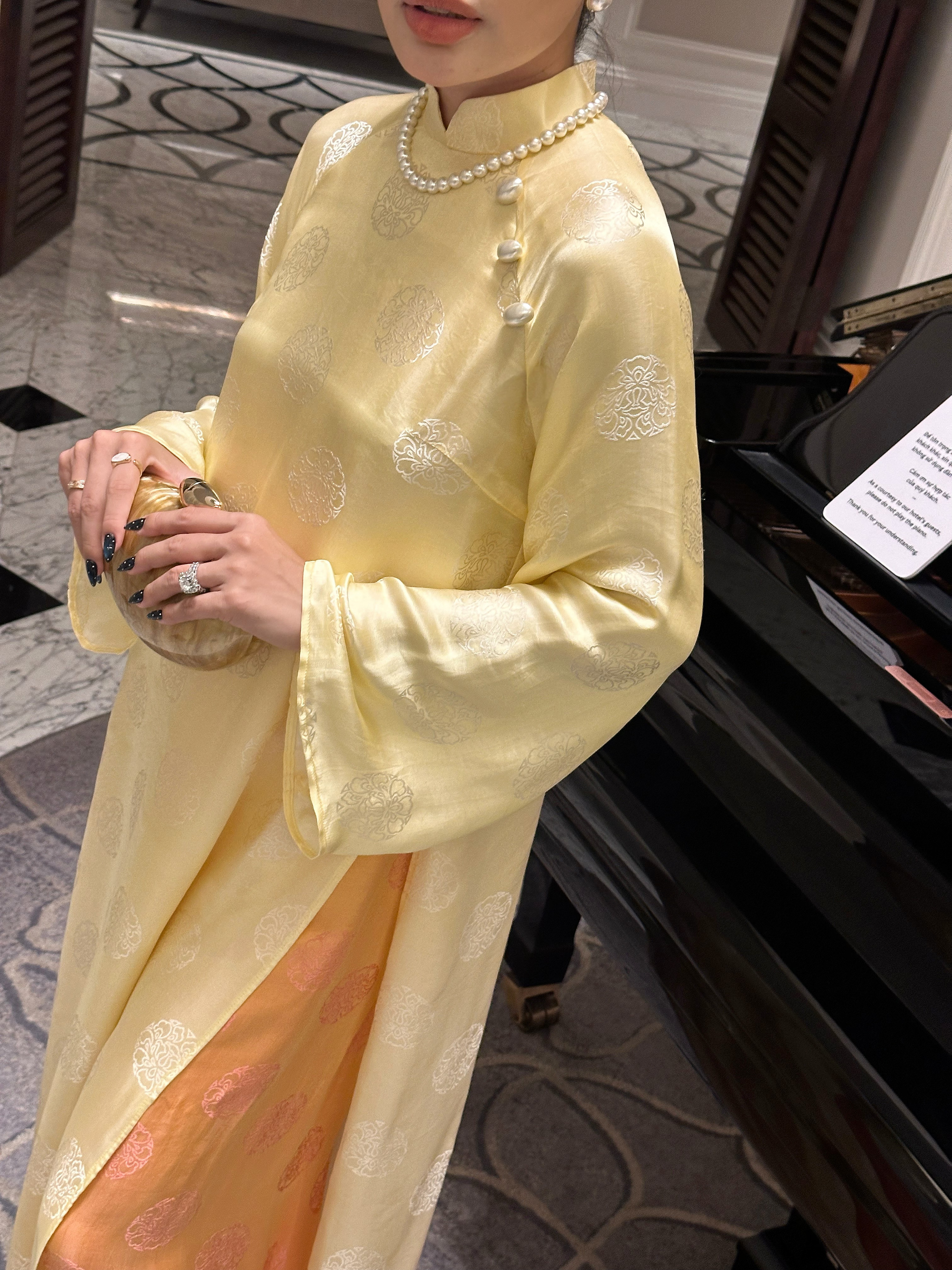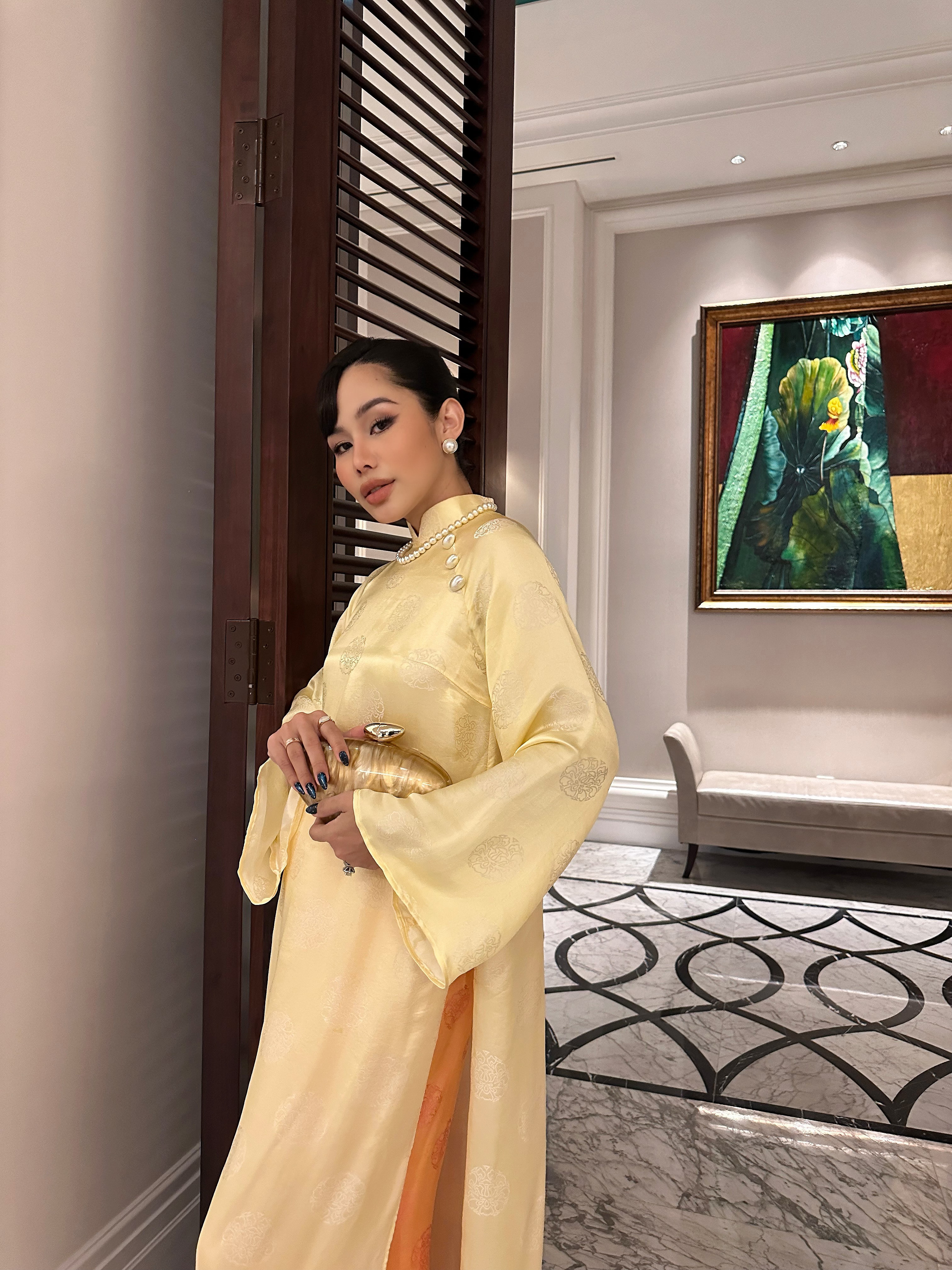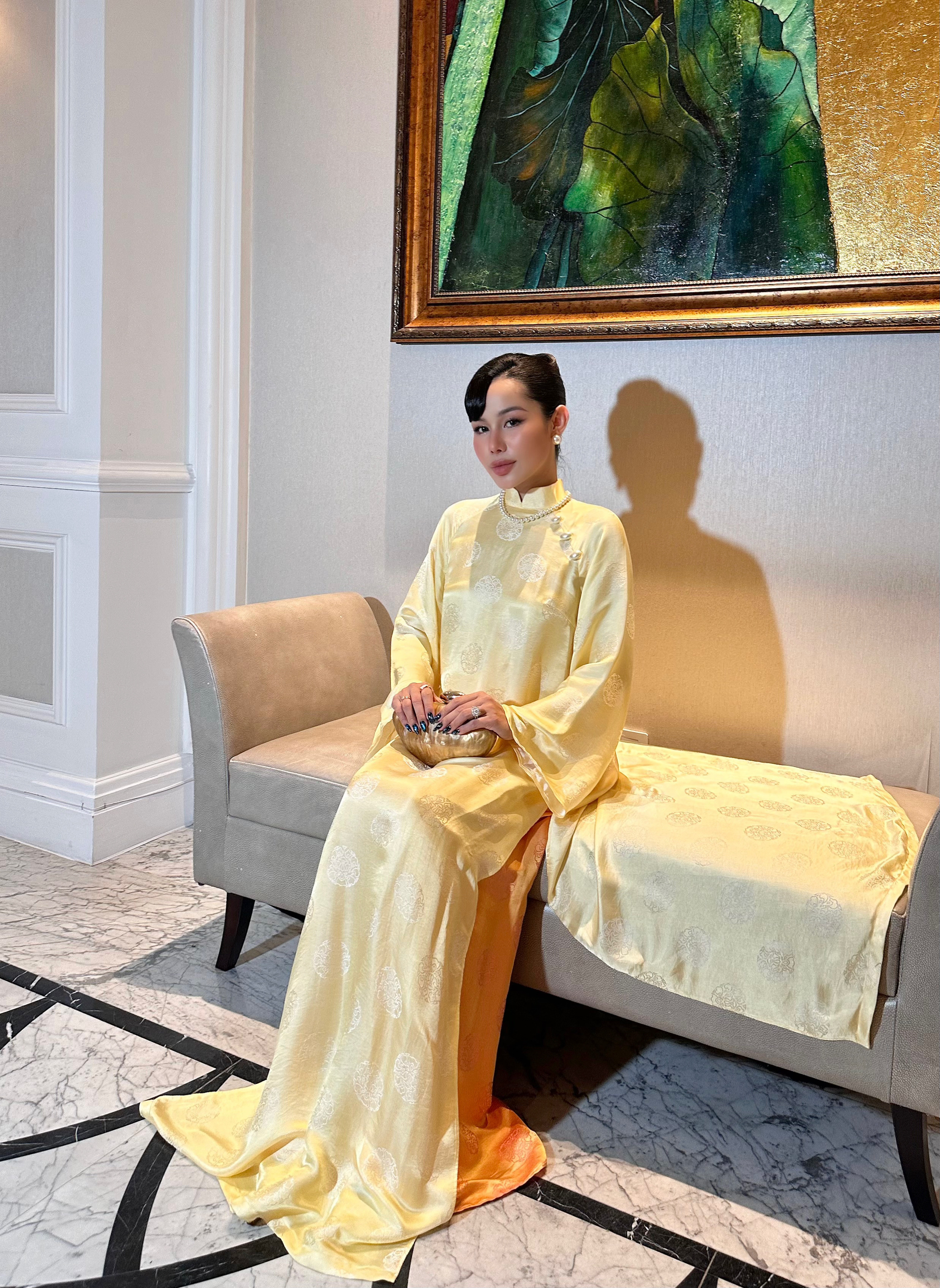 ▪️Lụa tơ tằm Nha Xá – dệt chìm thủ công hoa văn hoa sen truyền thống, bề mặt ánh nhẹ, mềm tay tạo độ rủ tự nhiên với đường cắt tinh tế đến từng chi tiết nhỏ, uyển chuyển theo từng bước đi mang đến cảm giác bay bổng nhưng vô cùng sang trọng.